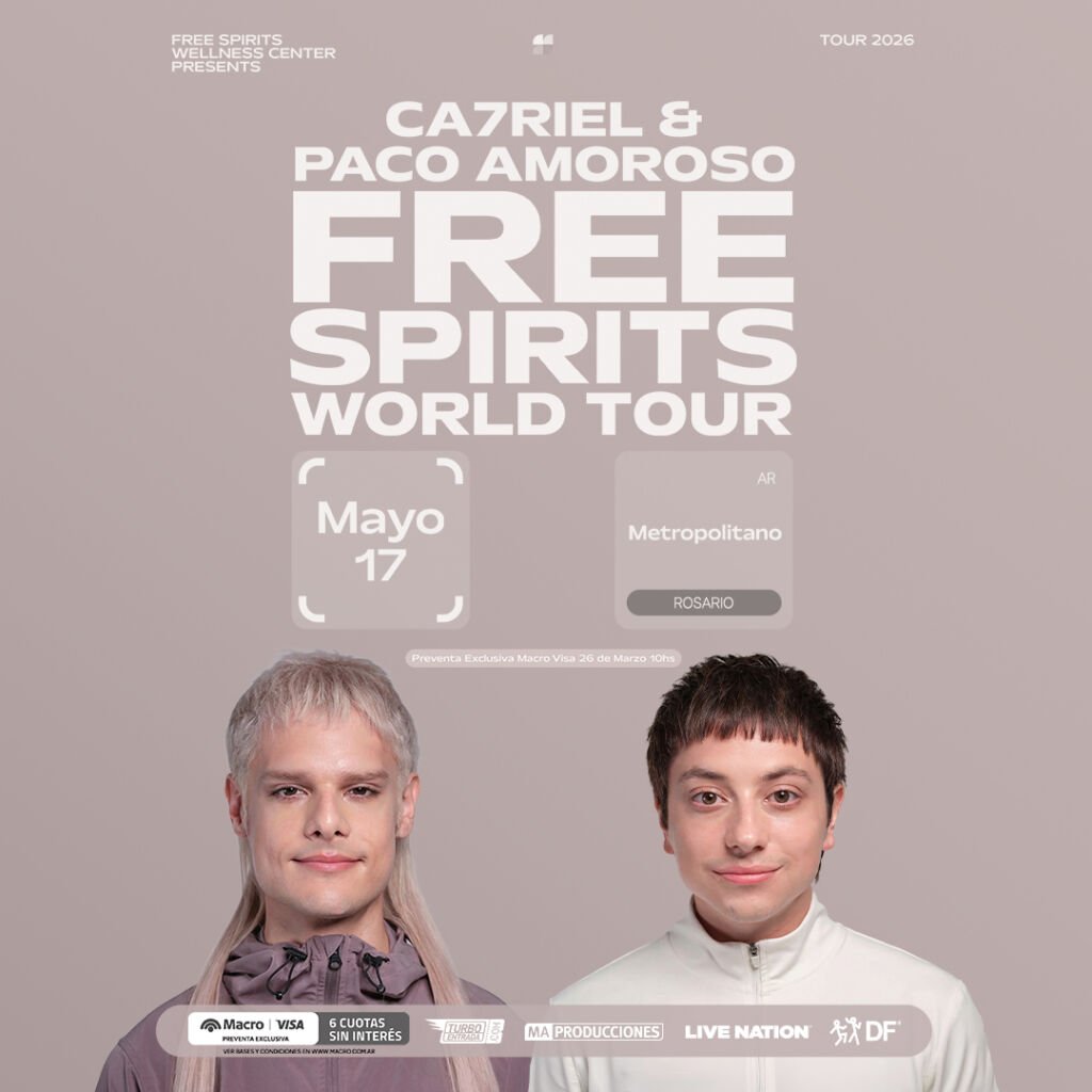 | Tras el lanzamiento de su nuevo álbum FREE SPIRITS, CA7RIEL & Paco Amoroso anuncian el FREE SPIRITS World Tour , una imponente gira que recorrerá Latinoamérica, Norteamérica, el Reino Unido y Europa. El tour llevará su explosivo show en vivo a recintos emblemáticos como el Red Rocks Amphitheatre, Radio City Music Hall, The Greek Theatre en Los Ángeles, O2 Academy Brixton en Londres y el Movistar Arena en Madrid,consolidando aún más su ascenso como una potencia global en los escenarios. A lo largo de FREE SPIRITS , CA7RIEL & Paco Amoroso expanden su ya impredecible mezcla de trap, rock, pop y espectáculo disruptivo hacia algo más grande, filoso y emocionalmente genuino, sin perder el humor, la volatilidad y la destreza musical que los han convertido en uno de los proyectos más magnéticos surgidos de Argentina en este siglo. El álbum llegó acompañado de un cortometraje que detalla su experiencia en el misterioso FREE SPIRITS Center, un retiro holístico ficticio fundado por Sting que sirvió como trasfondo conceptual para el lanzamiento. A través del proyecto, CA7RIEL & Paco —junto a sus invitados estrella: Sting, Jack Black, Fred Again.. y Anderson .Paak— se someten a las terapias de FREE SPIRITS de Sting para canalizar la muerte del ego, el absurdo, el ajuste de cuentas personal y una claridad ganada con esfuerzo en una obra que se siente tan frenéticamente divertida como inesperadamente reveladora. Más allá de la música, el dúo ha construido un universo creativo que se expande hacia la moda, el arte de performance y el espectáculo digital. Ahora, con FREE SPIRITS ya en la calle, CA7RIEL & Paco Amoroso entran en su momento más importante hasta la fecha, llevando su sonido de vanguardia y su electrizante show en vivo a audiencias de todo el planeta. CA7RIEL & Paco Amoroso mantendrán el impulso del destacado PAPOTA Tour del año pasado, embarcándose en su gira mundial 2026 para celebrar el lanzamiento de FREE SPIRITS. Con inicio el 14 de mayo en el Movistar Arena de Buenos Aires, el tour recorrerá Latinoamérica, Norteamérica, el Reino Unido y Europa. Para el show de Rosario la preventa exclusiva de Banco Macro con 6 cuotas sin interés será a partir del jueves 26 a las 10, y venta general a partir del viernes 27 a las 10 h en: turboentrada.com, Mitre 737 y boletería de Metropolitano. |