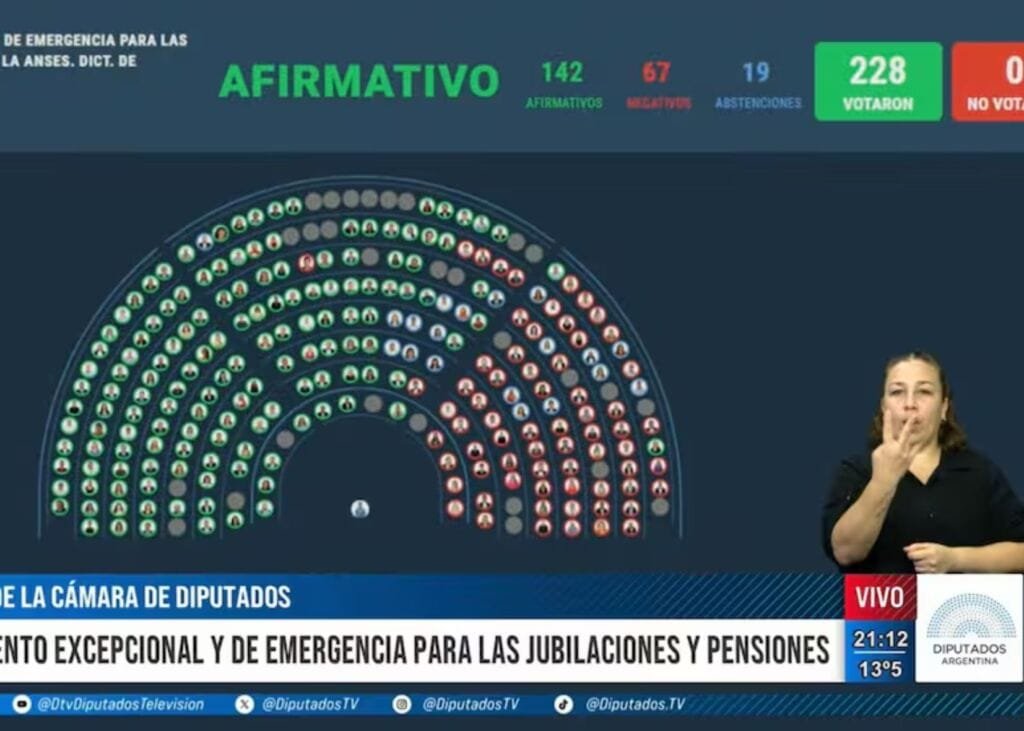 En desafío a las advertencias de veto por parte del Poder Ejecutivo, la oposición en la Cámara de Diputados aprobó esta noche con 142 votos positivos y 67 votos en contra y 19 abstenciones un aumento de emergencia en los haberes jubilatorios.