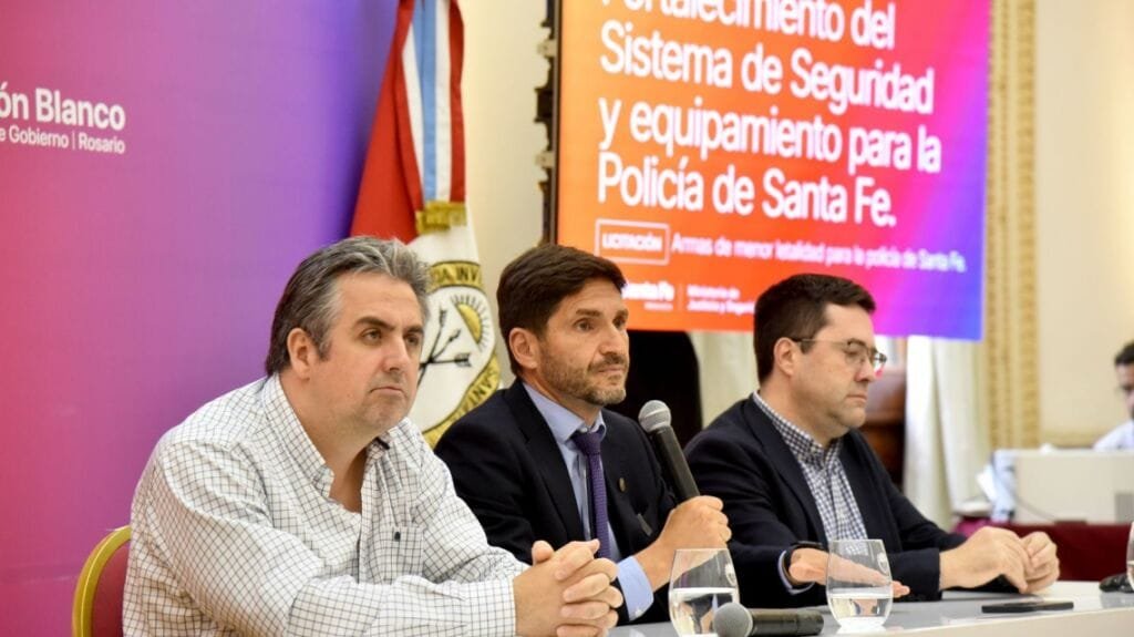 El gobernador Maximiliano Pullaro, junto al ministro de Justicia y Seguridad, Pablo Cococcioni y el subsecretario de Tecnología y Equipamiento del Ministerio de Justicia y Seguridad, Armando Faraoni, encabezó este miércoles la licitación para la compra de 100 pistolas de electroshock y otras 100 a base de dióxido de carbono que disparan proyectiles cinéticos, además de 200 bodycam y 600 cartuchos adicionales, todo destinado a la Policía de la Provincia. El presupuesto oficial es de $ 1.669.567.867.